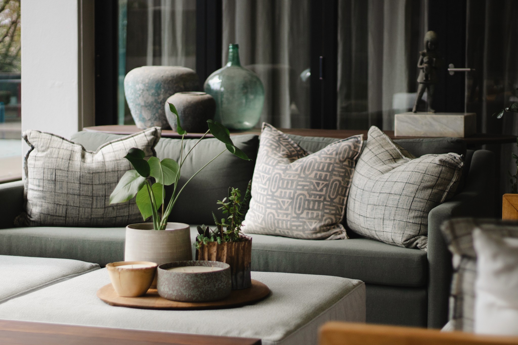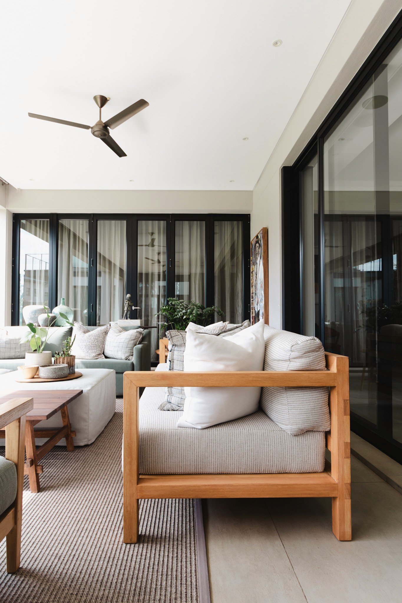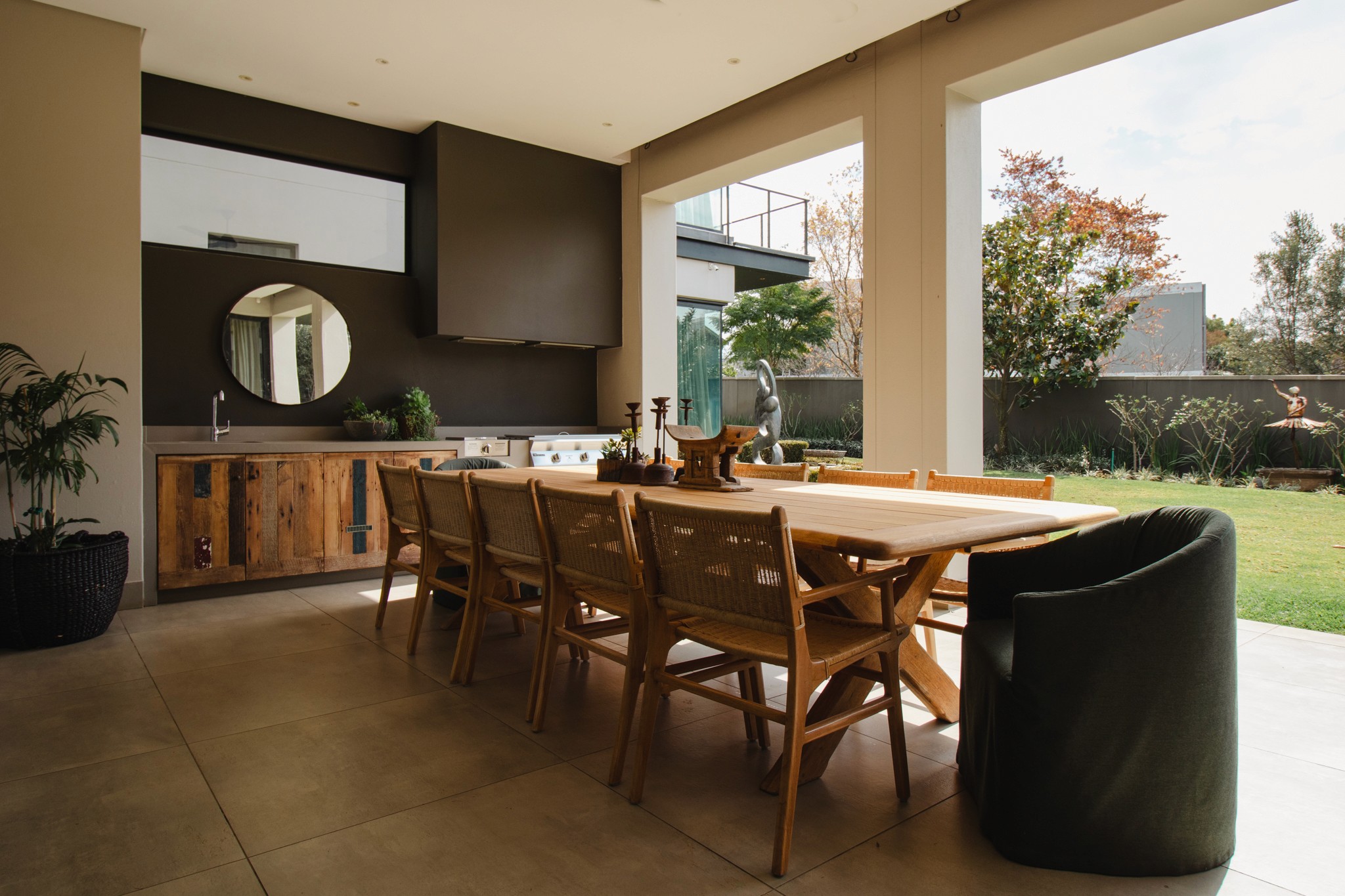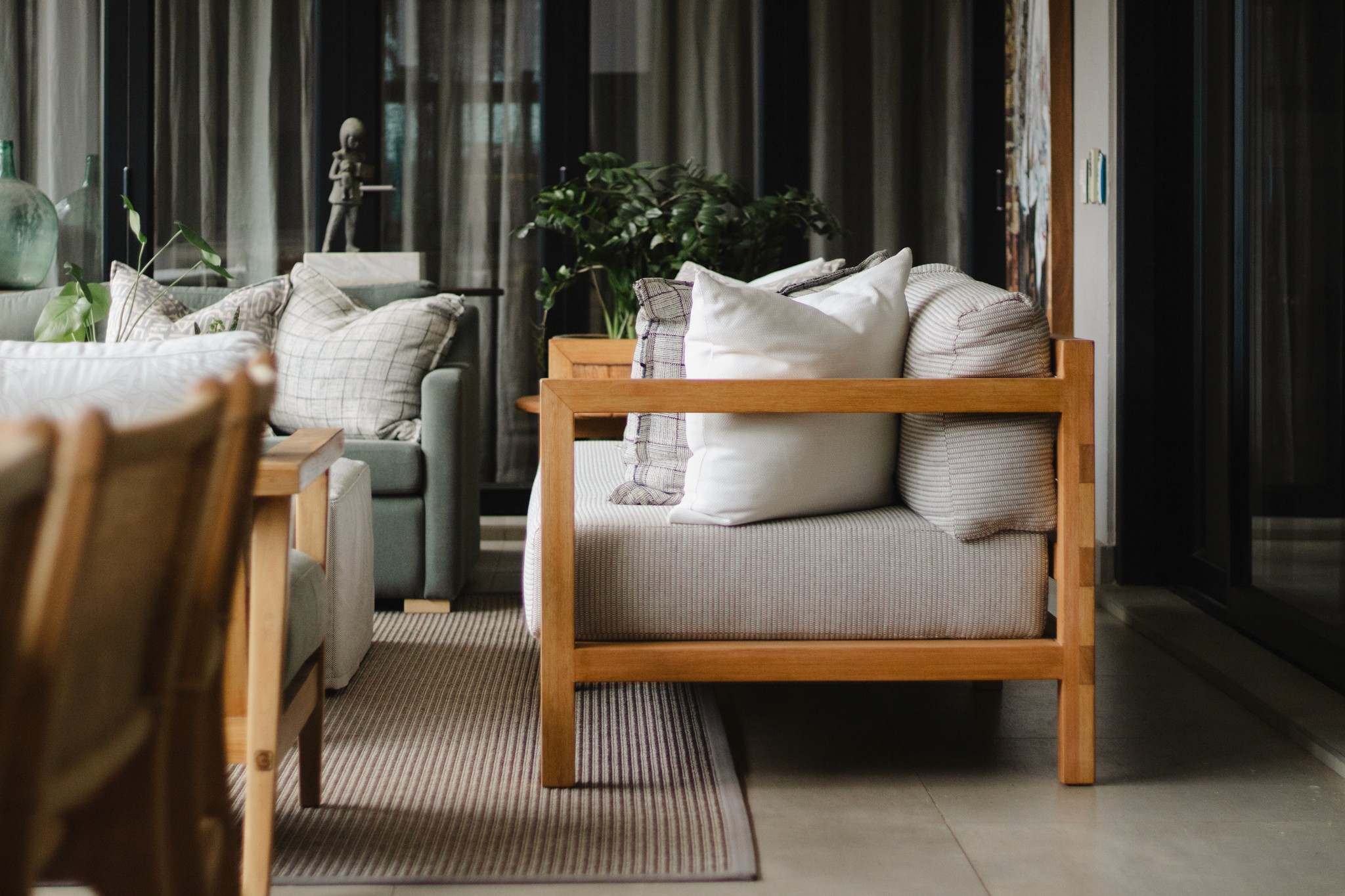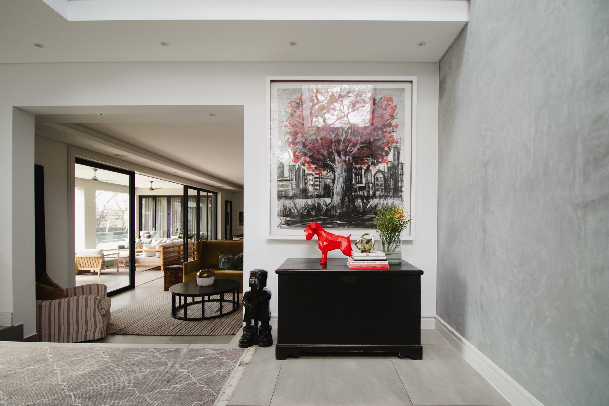 "At this beautiful, contemporary home in Inanda our scope was to re-do various areas designing custom furniture pieces, more suited to their needs and focusing on comfort and durability, as well as re-styling accessories to work alongside their impressive art pieces and collections. We continue to update this project working slowly through the areas as required, and based on their changing needs as their young family grows."
